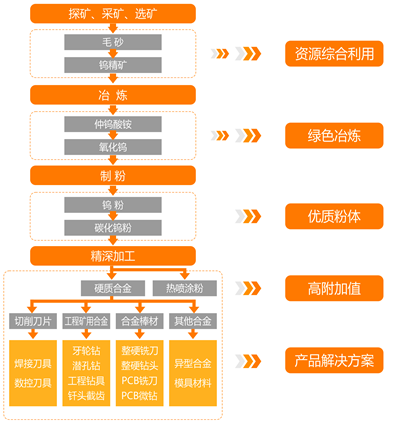 公司是国内钨行业产业链完整的厂商之一,建立了从钨上游采矿、选矿,中游冶炼至下游精深加工的完整一体化生产体系,完整的产业链为公司持续经营和拓展未来发展空间创造了良好条件。完备的钨产品组合系列可以使公司更好地满足不同客户需求,增加公司抗风险的能力。